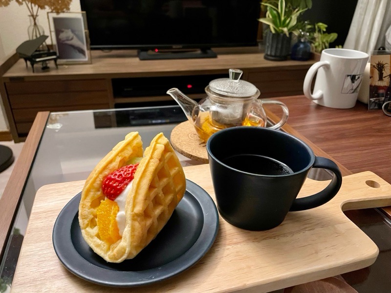昨日晩御飯のあと結局1つしか食べられず、残しててよかった。ワッフルはちょっとパサッとしちゃったけど、見えないところにバナナも入ってて、酸っぱくなくておいしかった( ; ; )