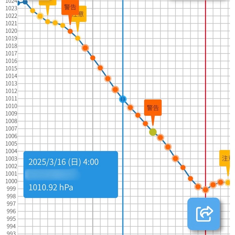 最近改めて気候の変化と合わせて頭痛の分析をしてみようとアプリを使ってみたら、必ずではないけど気圧が落ちてるときに痛みが出やすいかもしれない。昔は関係ない人だと思ってたけど、この急降下でこんな時間に頭が痛くなるなんて、さすがにやっぱり関係ありそうか?